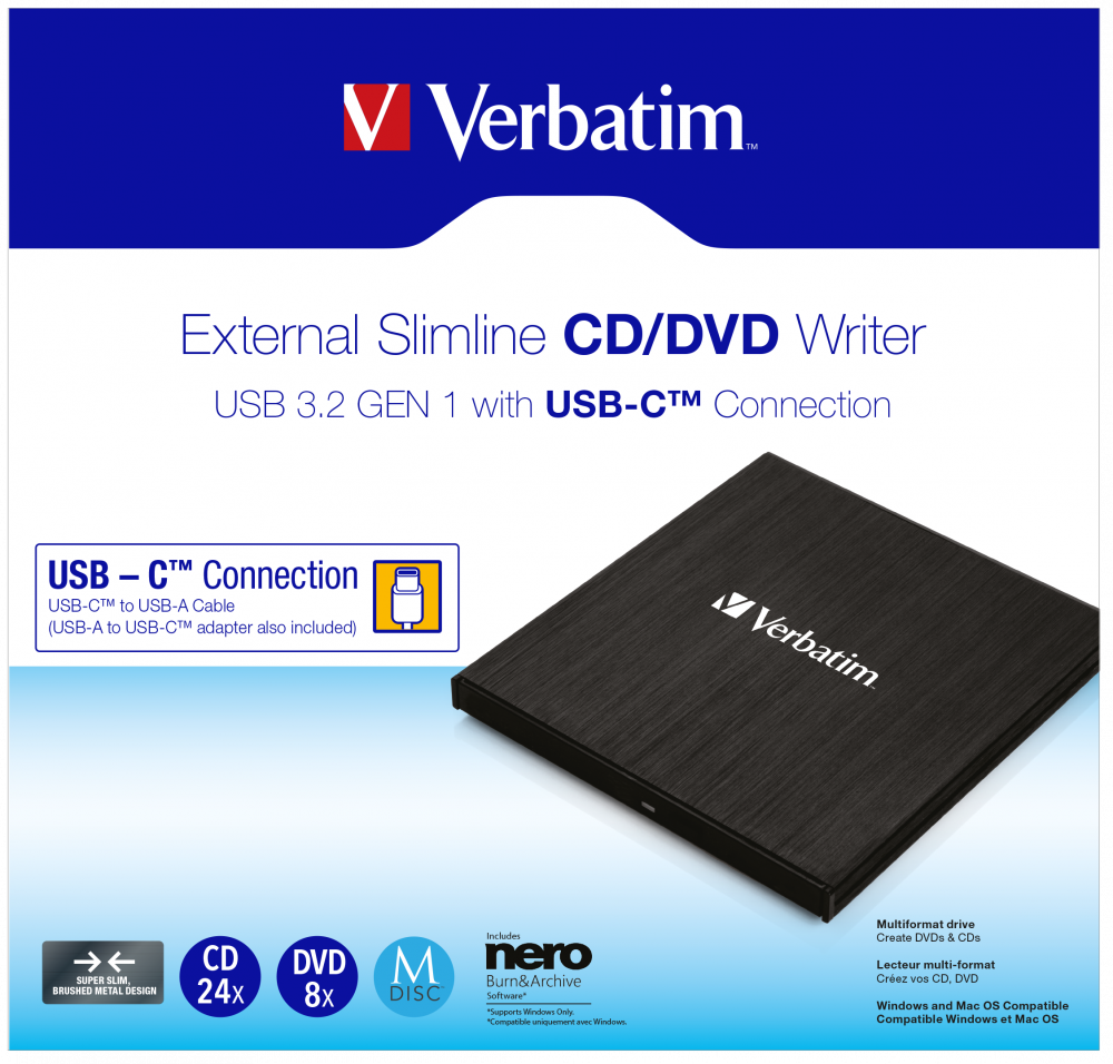 this compact device is the ideal accessory for your notebook, ultrabook,. weighing a mere 12 oz., this slim, lightweight external cd/dvd burner fits easily in a laptop bag and allows you to read/write cds and dvds any time, any place. Great for archiving important files, this writer allows. 8x dvd write speed, 24x cd write speed. safely save your files to cds or dvds with verbatim's external cd/dvd writer.